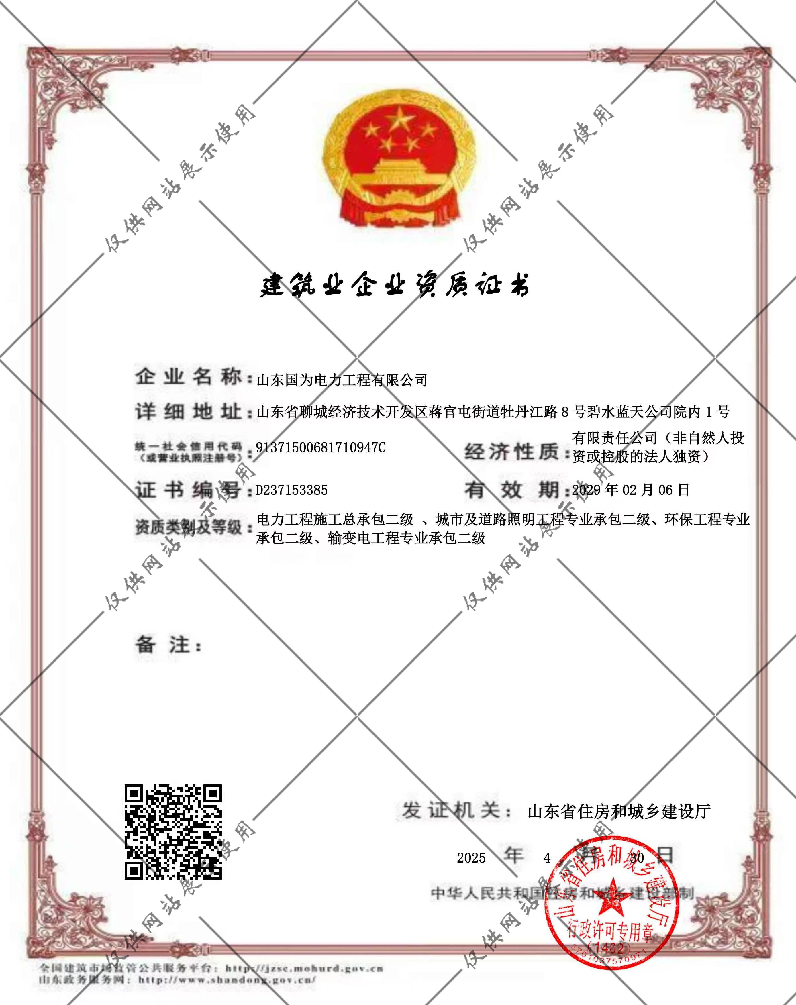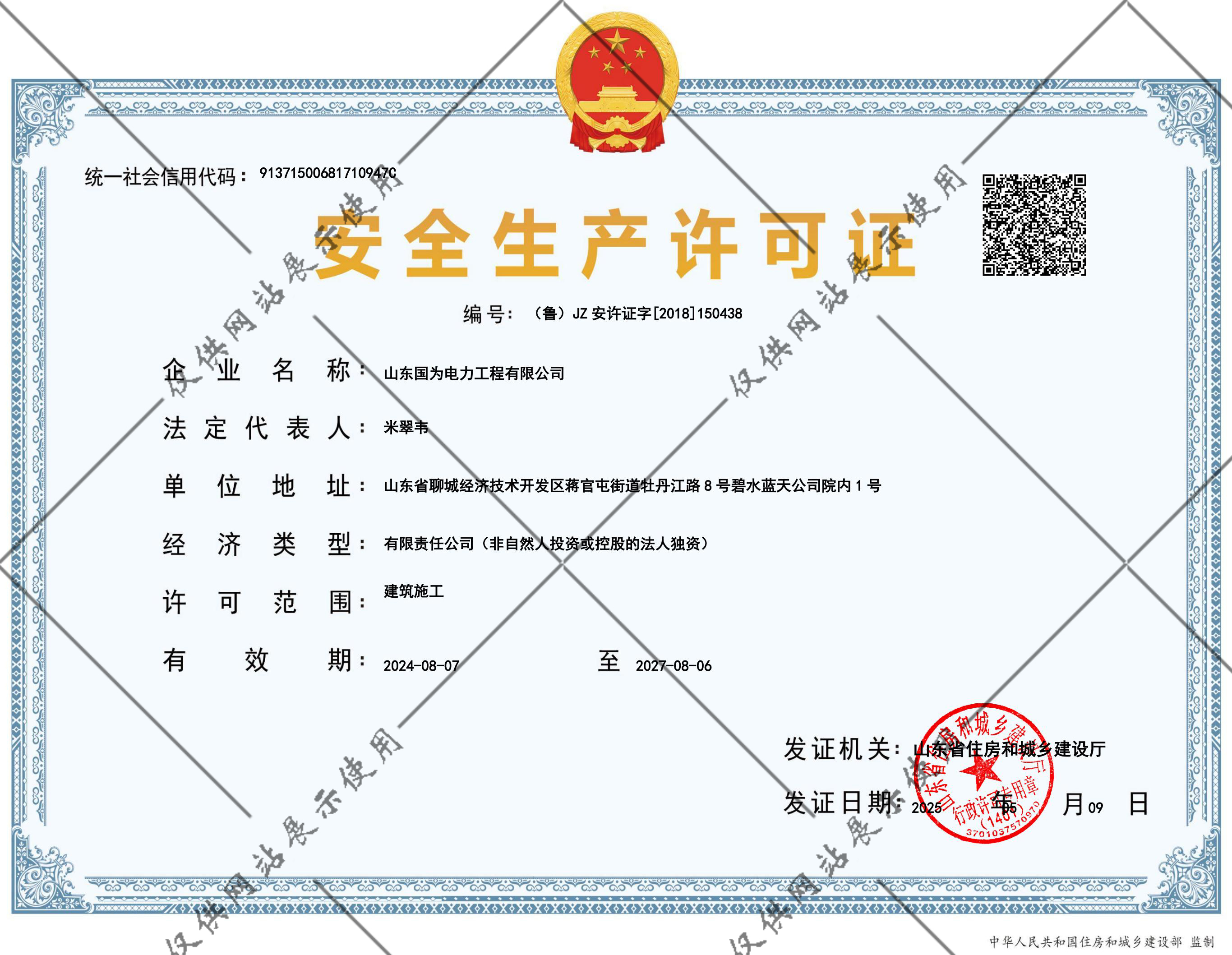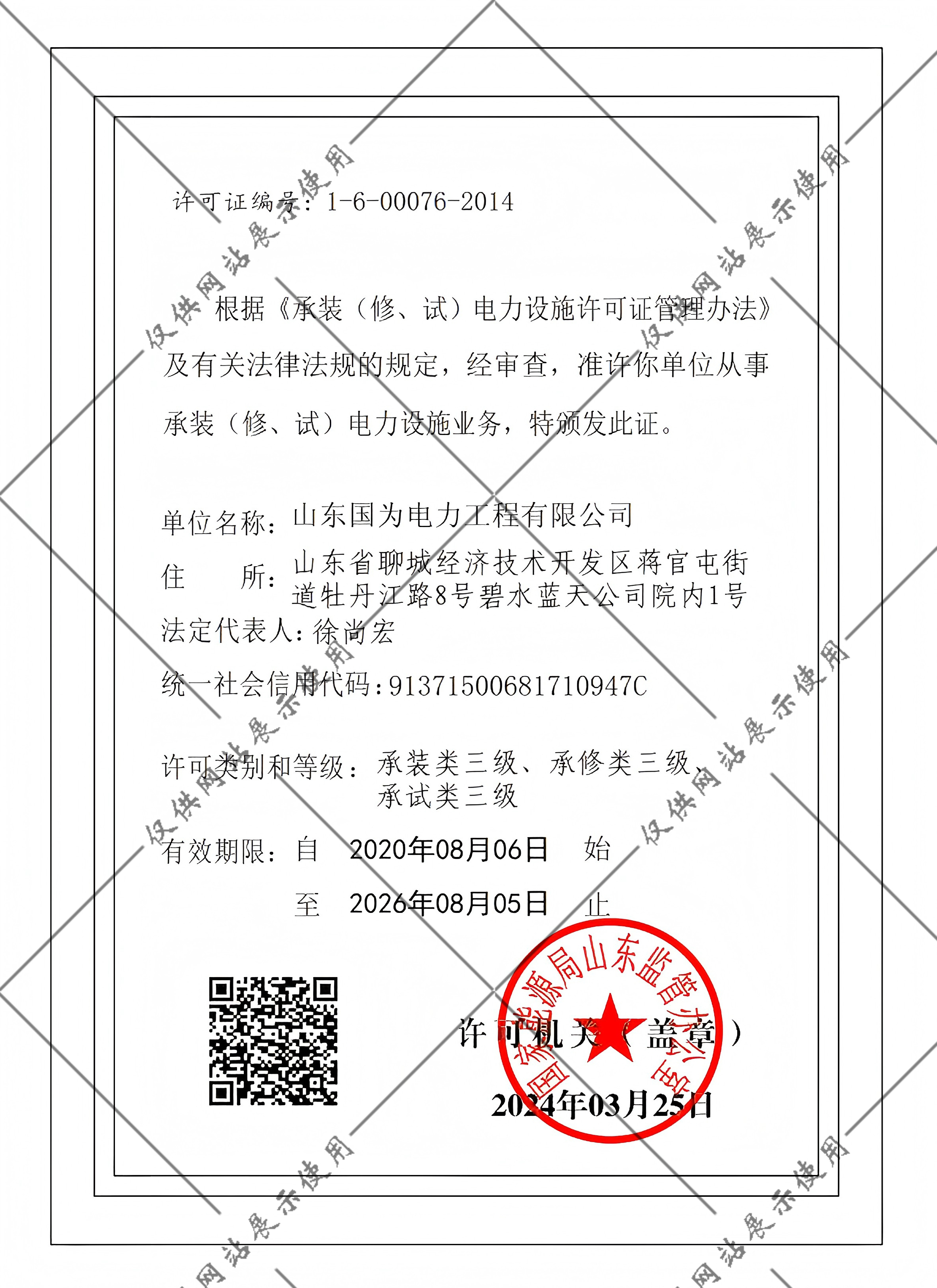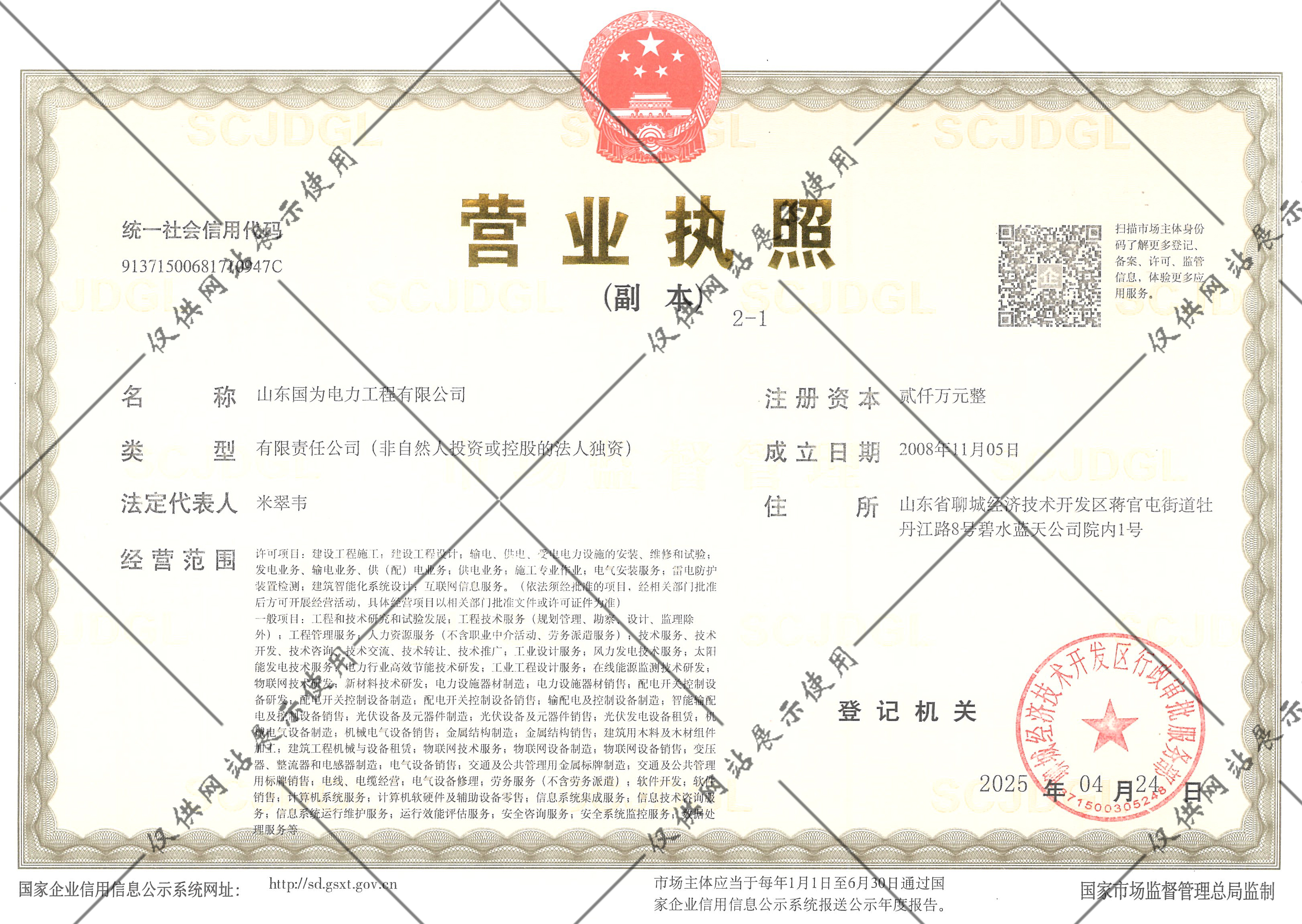 山东国为电力工程有限公司位山东省聊城经济技术开发区蒋官屯街道牡丹江路8号碧水蓝天公司院内1号,占地面积18余亩。于2008年11月05日在聊城市工商行政管理局注册成立,在公司发展壮大的10余年里,我们始终为客户提供好的产品和技术支持、健全的售后服务,我公司主要经营: